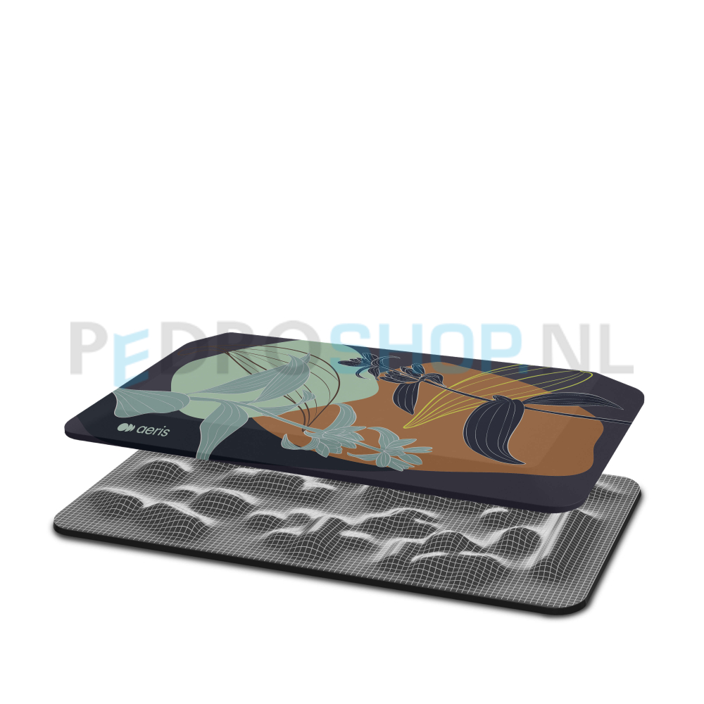 De buitenkant van de mat (het sta-oppervlak) is gemaakt van PU-intergraalschuim. Dit schuim is terugverend en ernom elastisch wat zorgt voor extra ontlasting en comfort. Deze Aeris Muvmat heeft een luxe hoes met lelie print.